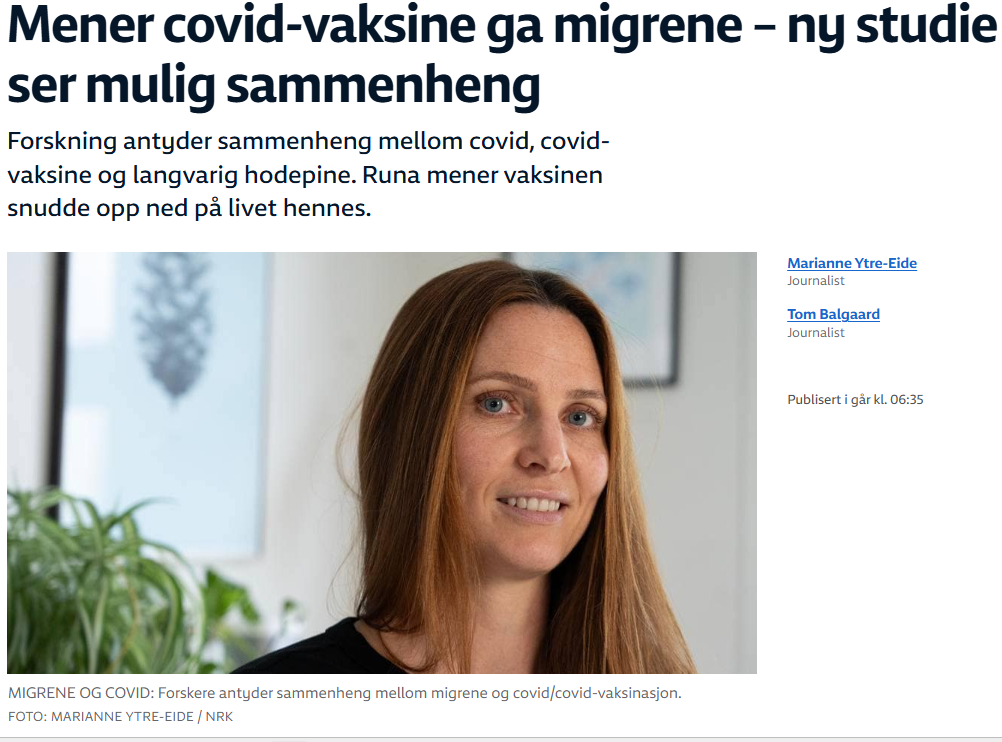 Tidligere i høst hadde NRK et oppslag av de litt sjeldne med første øyekast, fordi artikkelen gir svak medhold til at det kan være, muligens, sammenheng mellom migrene og Covid19-vaksinene.