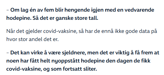 Man har altså gode tall på alle de som får migrene/hodepine av Covid-19, men dessverre har man ikke gode nok tall på de med migrene etter vaksine, men det er i hvert fall sjelden: