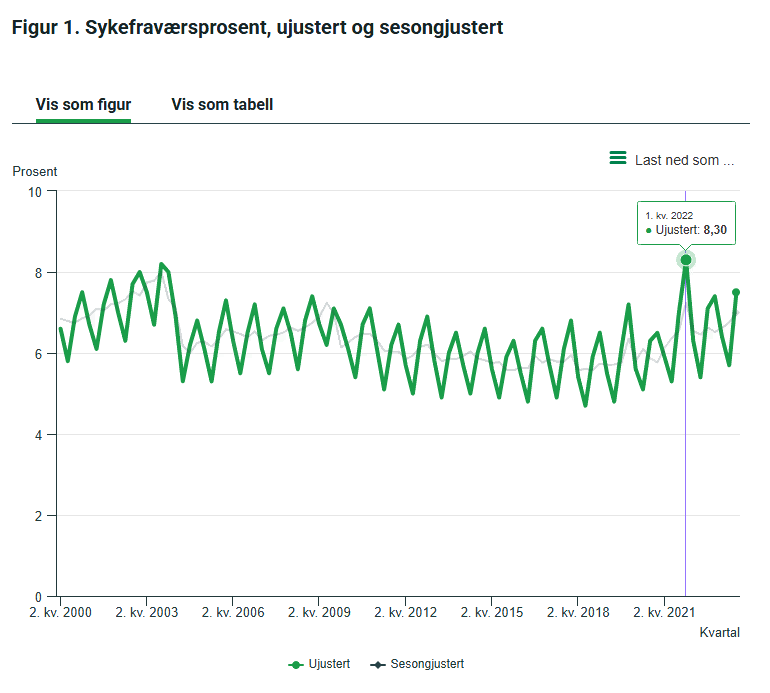 Også her begynner den unormale stigningen høsten 2021, og også her er altså toppen første kvartal 2022. Når SSB skal definere toppen av sykefravær med ord og ikke tall sier de det helt korrekt slik:
