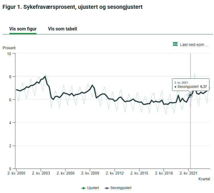 Som du ser er dette altså tredje kvartal 2021, som betyr månedene juli-august-september. Vi får altså merkverdig høyt sykefravær sensommeren (!) 2021. Høyt sykefravær i sommerperioden altså – la oss nå ha gjettekonkurranse: