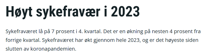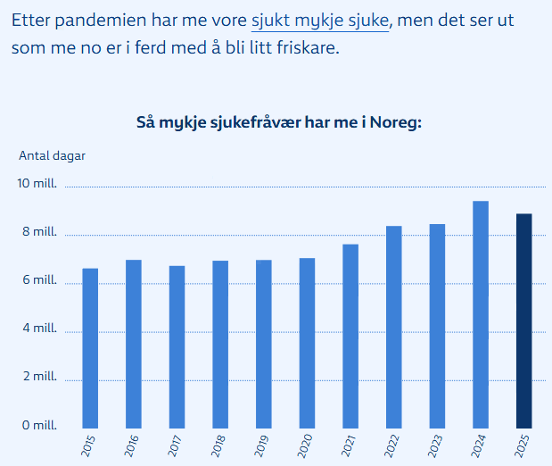 Videre, onsdag 15.10.25 kunne vi sannelig igjen lese om sykefraværstall på NRK. I artikkelen har NRK lagt ved et søylediagram, som av en eller annen grunn viser 2. kvartal hvert år – men her ser vi følgende: