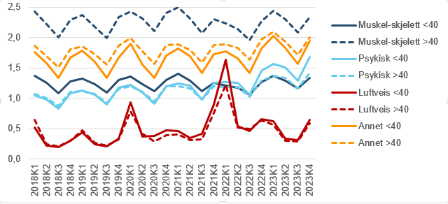 Du store min, det er også her først høsten 2021 at tallene øker merkbart, og den soleklare markerte toppen er igjen 1. kvartal 2022. Tallene også for luftveisproblemer blir altså først et markant problem 1,5 år (!) ut i pandemien. Hele pandemiforløpet i 2020 er altså uten dramatiske endringer til og med også for luftveis-tallene!