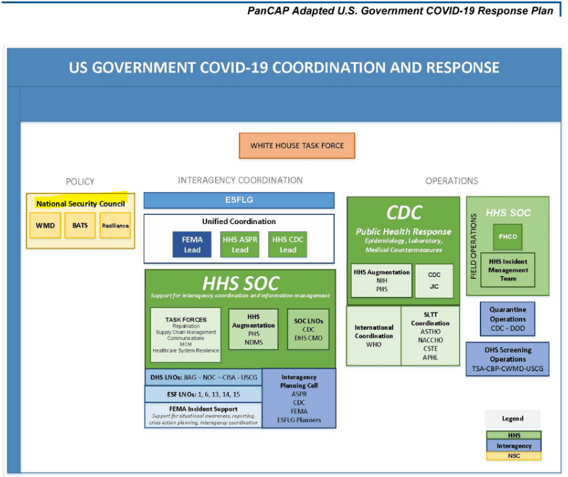 Den offisielle fortellingen om covid-responsen er at den ble ledet av helsebyråkratiet under rådgivning av eksperter under oppsyn av de folkevalgte. Realiteten er at det var en amerikanskledet planlagt militær respons ledet av NSC ( National Security Council se PANCAP) nasjonalt under FEMA og internasjonalt drevet av DOD (Department of Defense)