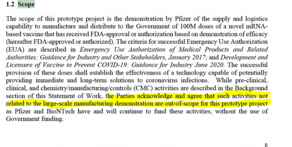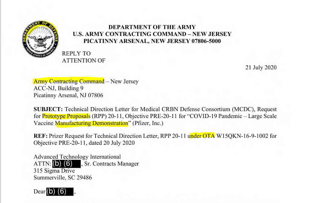 DODs/Pfizers vaksineutviklingskontrakt 3 uker senere 21/7 2020 unntok vaksinen fra alle krav i legemiddellovgivningen ved å lage en OTA (Other transaction authority) «prototype&demonstrasjonskontrakt».