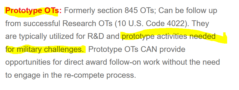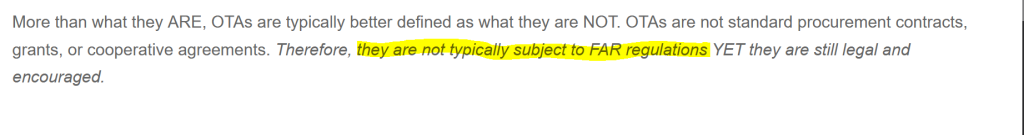 OTA er en klasse kontrakter brukt til «militære utfordringer». Reguleringsbestemmelser (som testing, produksjonskvalitet, oppbevaring m.v.) kan bremse eller hindre utviklingen. Militæret inngår derfor uregulerte kontrakter.