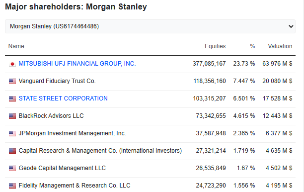 Norges Bank har naturligvis aksjer i Pfizer, men det er ikke poenget nå. Kikker vi lenger ned på listen så ser vi Morgan Stanley, og andelseierne der er: