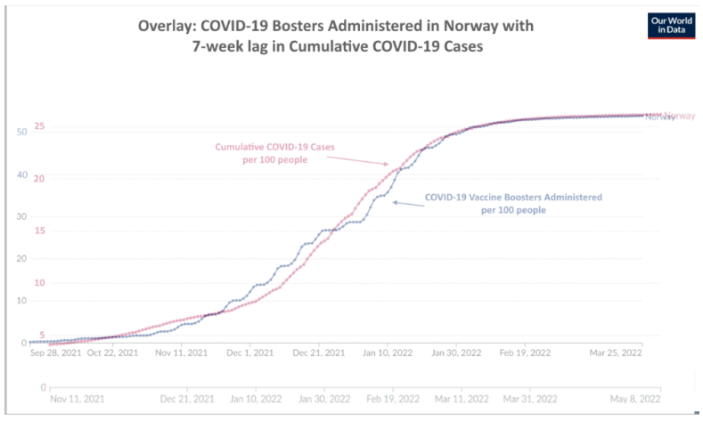 Men det er mer enn en lang rekke anekdoter bak dette. Jeg har skrevet om vaksinering som årsak til Covid-19 tidligere, og den canadiske statistikeren Regina Watteel har påpekt det samme, samt vist hvordan smitten korrelerte perfekt med booster-utrullingen i Norge. Her henter jeg hennes graf som viser smittetallene sammenlignet med utrullingen av booster-dosene (dose 3) i Norge: